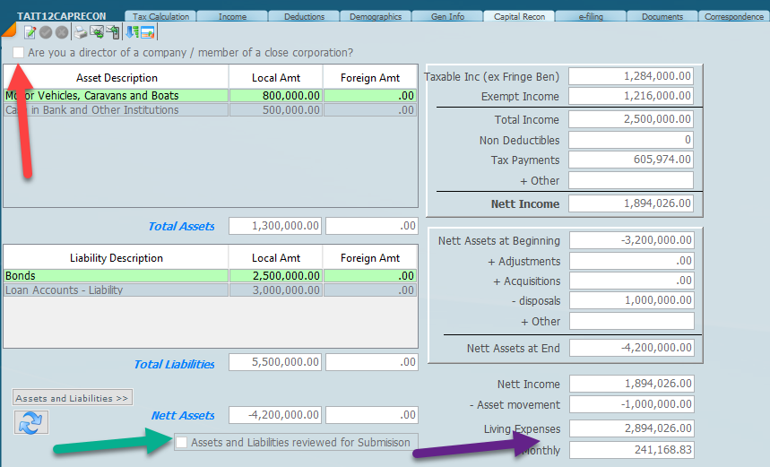 The screen below indicates a summary of the capital reconciliation on an IT12 tax return. On the right hand side you have the Capital Recon with the annual living expenses calculated and the monthly living expenses on the bottom right hand side. On the left hand side you have a summary of assets and liabilities. There is a button called assets and liabilities on the bottom and if you click on this, this will take you to the asset and liability screen which you will see shown further below. Just below the asset and liability button is a refresh tab, which you should click on to get the latest capitial reconciliation calculation