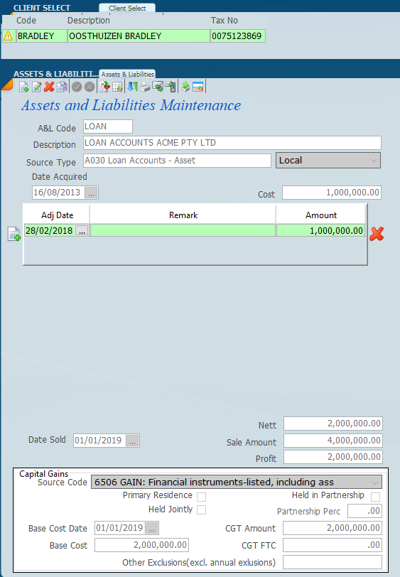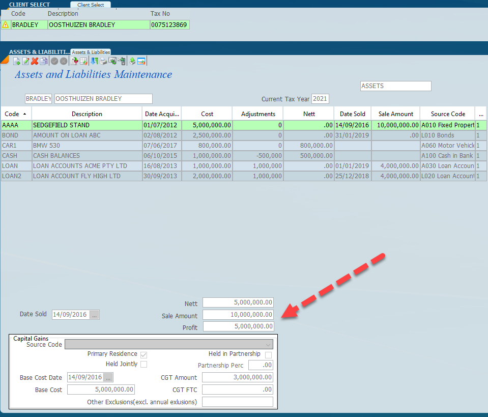 By inserting the base cost and the base cost year and inserting the sale amount of the assets the system will calculate the capital gain that is to go into the tax calculation.