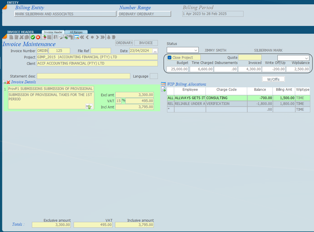 Click on the switch view icon and you will get the form for entering an invoice. You will notice at the top we have got the Billing Entities so by clicking on the down arrow we can select the billing entity and on the right hand side we have got the Number Range. The principal of this is that the invoice entry works in the same way as the project invoicing works. The only difference here is that you have a choice as to whether you want to do a direct invoice against the client (does not reduce work in progress) or you want to do it against the project. To get an idea of how the invoicing works please refer to the section on Project Invoice